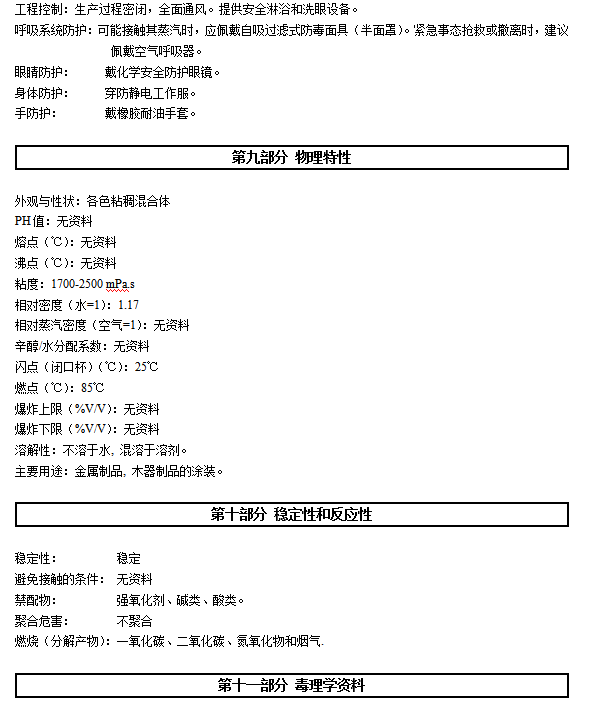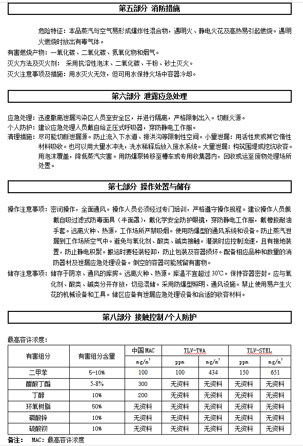 警告:会引起眼睛和皮肤的刺激。反应的蒸汽可能会引起过敏人群的呼吸道刺激。可能会引起皮肤过敏反应。避免呼吸蒸汽。请勿触及眼睛、皮肤。要使用眼、耳、皮肤的防护用具,使用合适的面具,以避免潜在的呼吸道刺激。使用后用清水彻底的清洗皮肤。如有不适请咨询医生。衣物再次使用前要洗涤。如果没有呼吸要进行人工呼吸,最好嘴对嘴,并请医生处理。灼伤:放热反应会使产品变热,超出正常水平。在混合后要小心处理。使用手套。急救:如果不慎接触了眼睛,立即用清水冲洗至少 15 分钟,并脱去污染的衣鞋,用肥皂清洗接触后的皮肤。